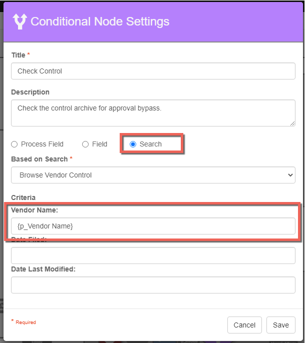 - Pass the Vendor Name into the Search condition in the Criteria section of the Conditional Node in notation form: {p_Vendor Name}.