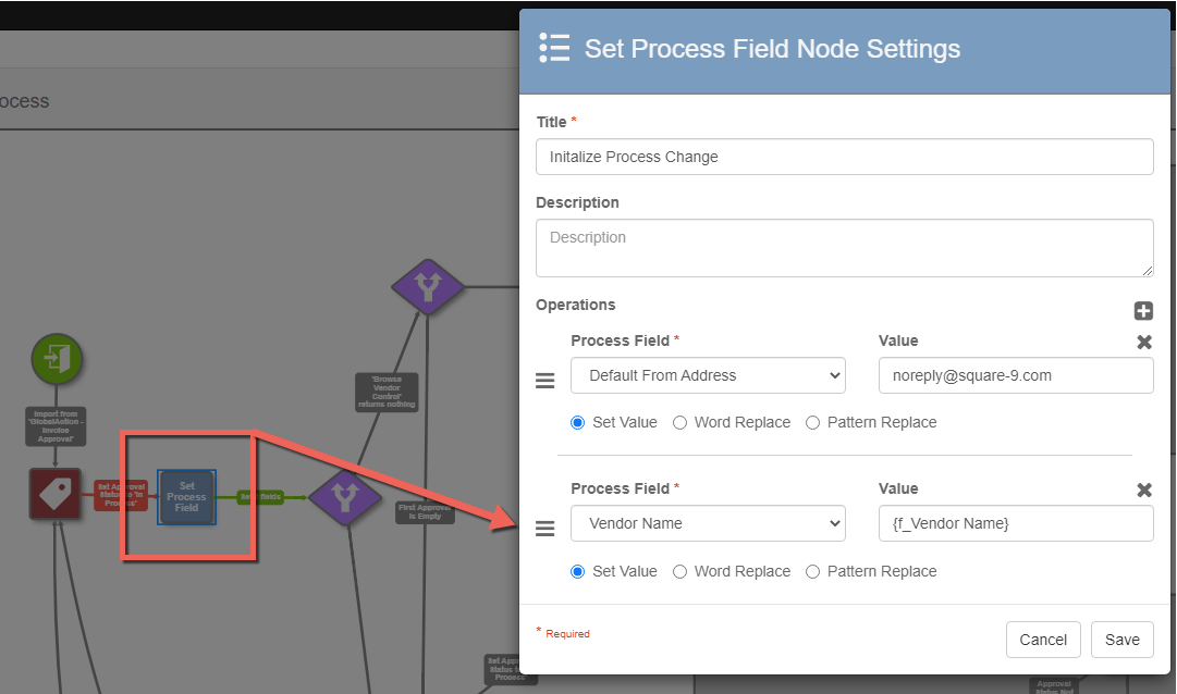 - Add an entry to set Vendor Name in the Set Process Field Node at the beginning of the workflow, immediately after the first Set Field Node. If your GlobalSearch field is “Vendor Name”, the Value in the Set Process Field node in Notation form would be: {f_Vendor Name}
