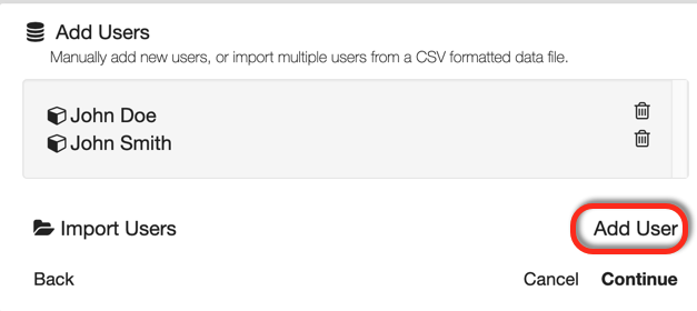 Add users to your GlobalSearch instance one at a time by clicking Add User or import a list of users via CSV to add credentials and permissions in bulk.