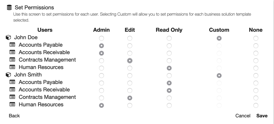 Permissions are typically applied for the user across the entire business application. To apply different levels of permissions for a user against the individual Archives within a Business Solution, select the Custom Permissions button. This will expand the options for permissions allowing you to apply a more granular security model.