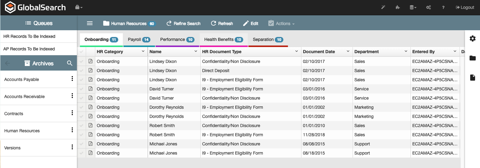 The unique design of GlobalSearch C2 for Business Essentials allows you to take advantage of View Tabs which automatically categorize your documents based on a field value. In the case of the Human Resources archive, the tabs represent the different document categories in an Employees file. These include; Onboarding, Payroll, Performance, Health Benefits and Separation documents. In the event you decide to Add or Change values within the HR Category Field list, you will also need to update both the archive and the search to have it appear as a view tab.