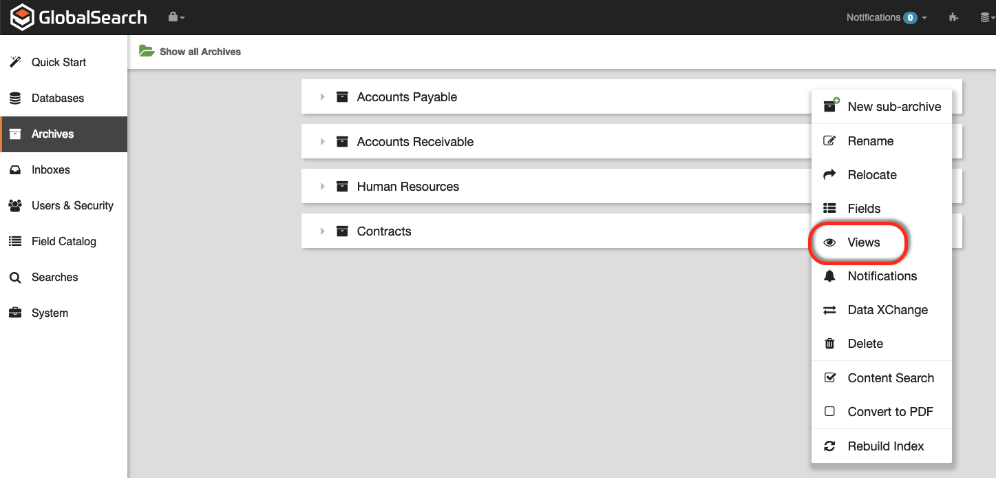 - Click on the ellipses to show the actions you can take on an Archive and select Views