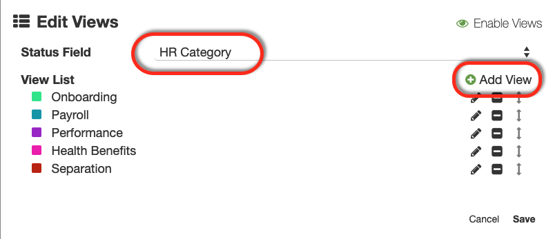 - The view Edit screen will appear with the active status field that determining the view current categories listed within the Status Field.