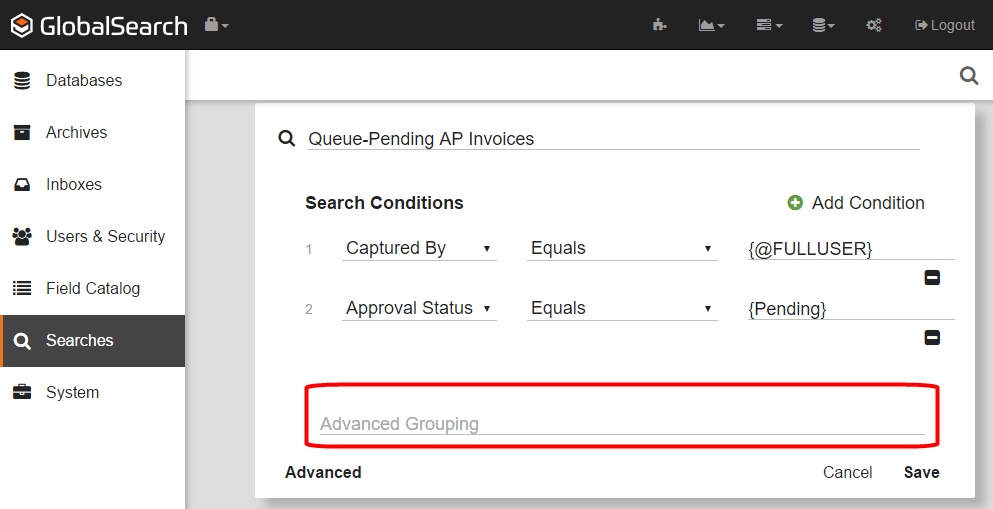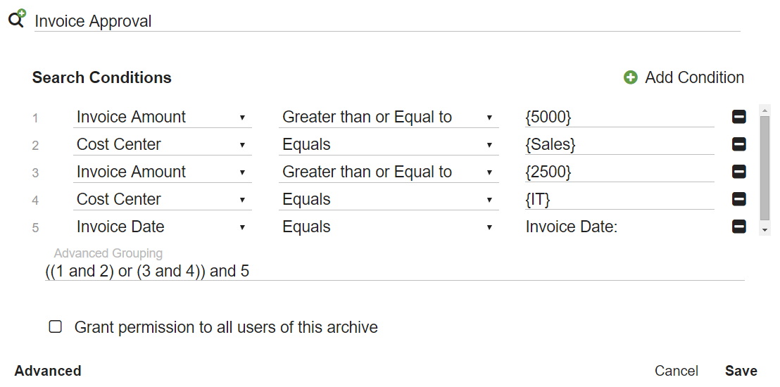 Create a Search called “Invoice Approval” which should return any Sales invoice > $5,000 or any IT invoice > $2,500. This Search would be impossible with the standard query logic. By default, the Search will be an AND based search (1 and 2 and 3 and 4 and 5). To enable OR-based searching, change the settings in the Advanced Grouping text box using a combination of parenthesis as well as OR statements to ((1 and 2) or (3 and 4)) and 5.