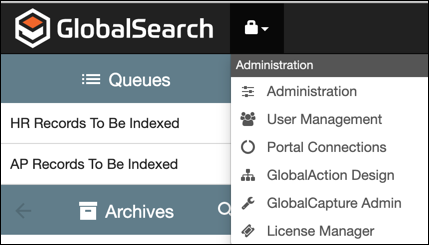 You can select a Batch Portal from the GlobalSearch toolbar. The Batch Manager interface for that Portal will open. Refer to the GlobalAction documentation for details on Batch Manager. Batch management is a feature leveraged by those users working with documents that are active in a GlobalCapture or GlobalAction workflow.