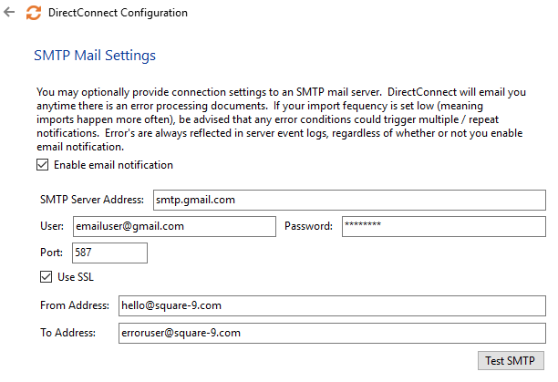 - DirectConnect can optionally send email notifications if there is ever a problem detected with an import. To enable email notifications, use the SMTP mail settings screen to provide necessary details to connect to an SMTP mail server. Be sure to use the Test SMTP button if you are setting up email. Incorrect settings or account credentials will prevent successful email sending.