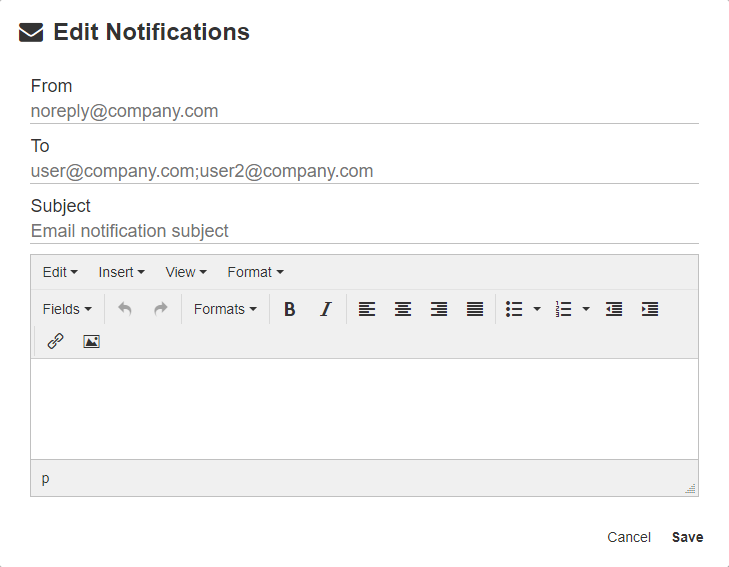 - In the Edit Notifications dialog that appears, enter the email address of the sender in the From box. Note that the From field does not have to be for an active email account, although your mail server might require messages be sent from a specific sender address. Contact your email administrator for details on proper configuration for outbound SMTP mail messages.