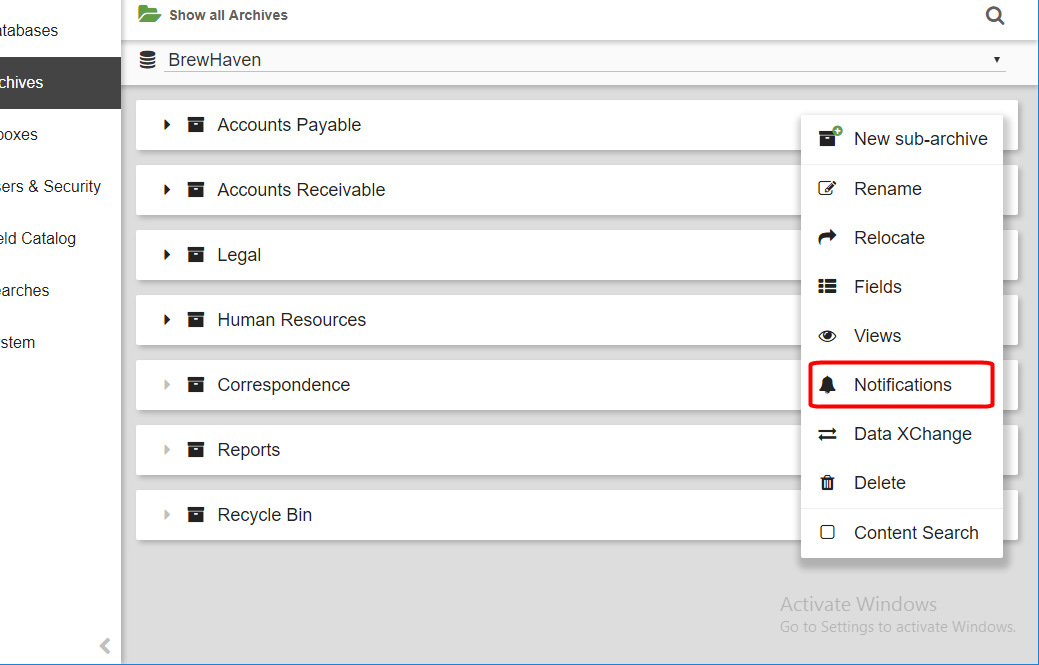 - To edit notifications in an existing Archive, click Notifications from the More Options () icon for the selected Archive.