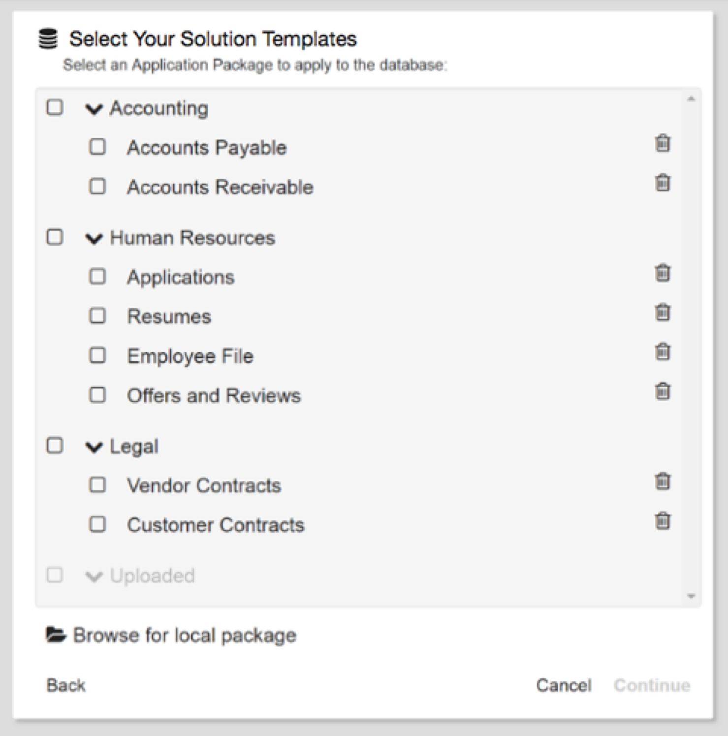 If you already have an existing database you can easily apply additional business solution templates to it through the use of Quick Start. For example: if you initially set up GlobalSearch to better manage your Human Resources information and later decided to add a solution for Accounts Payable, this could be added through QuickStart with just a few quick steps.
