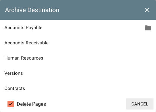- In the Archive Destination window, select the archive to save the new document. Optionally, enable/disable the Delete Pages. Enabling this feature will remove the selected pages from the source document. The original document will need to be saved if the desired result is to have the pages removed from the source.