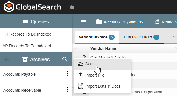 For users with basic or more ad hoc capture needs, the GlobalSearch web client offers multiple options for document capture including:
