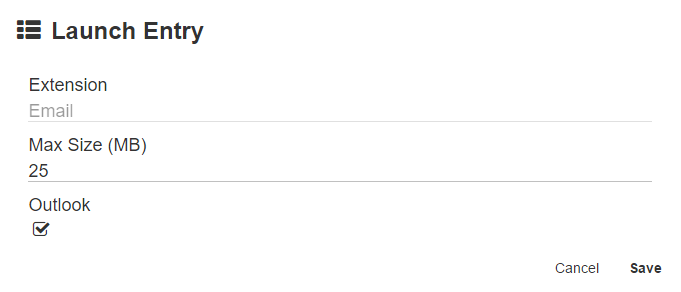 Microsoft Outlook is the default email application; it does not require further configuration. You can change the Max Size setting, if you wish. In the Max Size (MB) text box, enter the maximum size (in megabytes) that attached files can be, per email message. You can type in the amount or use the Up/Down arrows to the right of the box.