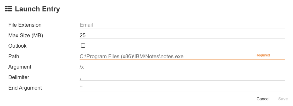 Email is a specific and static entry in the Launch table that takes on special meaning. Rather than launching a document for editing, the Email option is used to create new mail messages. With this entry configured, the email options in the Action menus will create a new mail message with one or more documents attached. Microsoft Outlook® is configured by default; no additional configuration is required to use it. Alternately, settings may be modified to support other mail applications. Square 9 does test functionality with IBM Notes® in addition to Outlook, but any mail application that supports creating new mail messages using command-line arguments can be configured to work with the GlobalSearch email options.