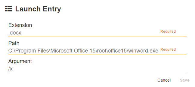 In the Path text box, enter the full path and filename of the executable for your launching application. For example, .DOC and .DOCX extensions would require the full path to winword.exe in this field.