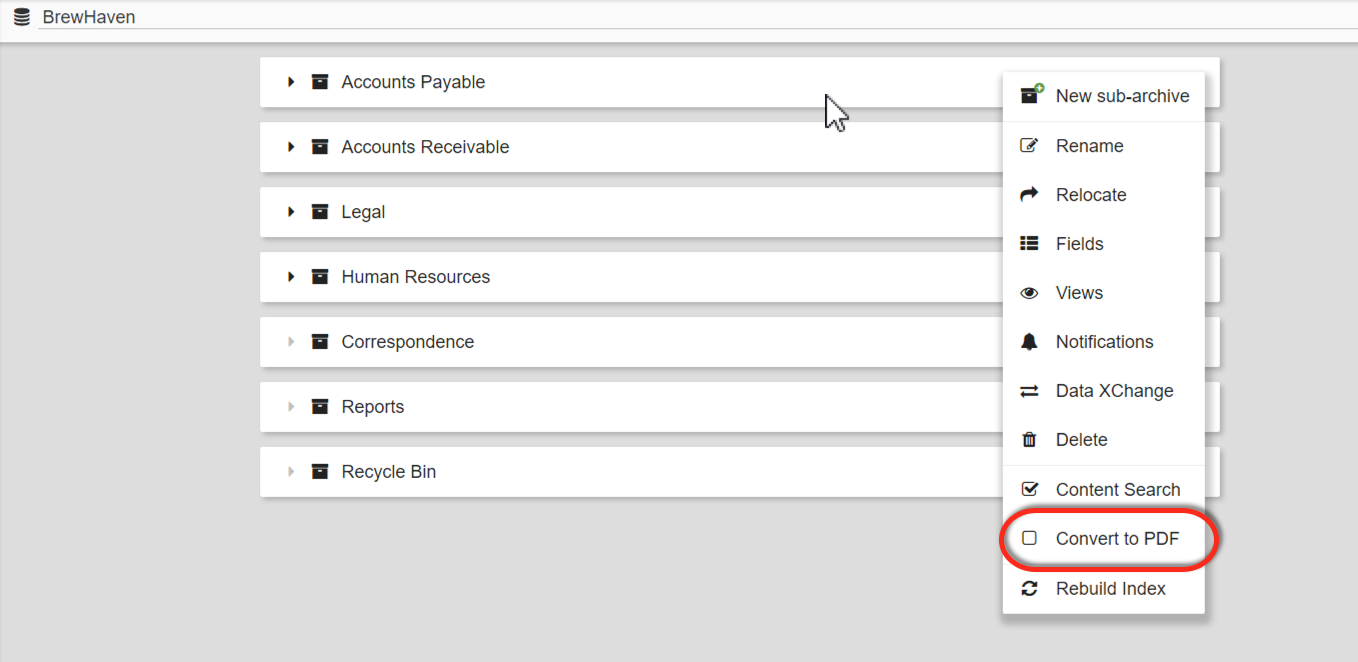 To enable converting in an existing Archive, click Convert to PDF from the More Options () icon for the selected Archive.