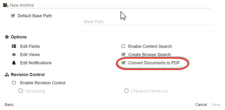 Note that enabling this feature on existing Archives does not trigger PDF conversion on documents already in the system. If you need to perform a mass conversion of documents already present in an Archive, there are a number of ways to achieve this result, but their impact on the system should be carefully considered. Please contact Square 9 Software Support if you need assistance with understanding how best to approach this type of configuration in your specific environment.