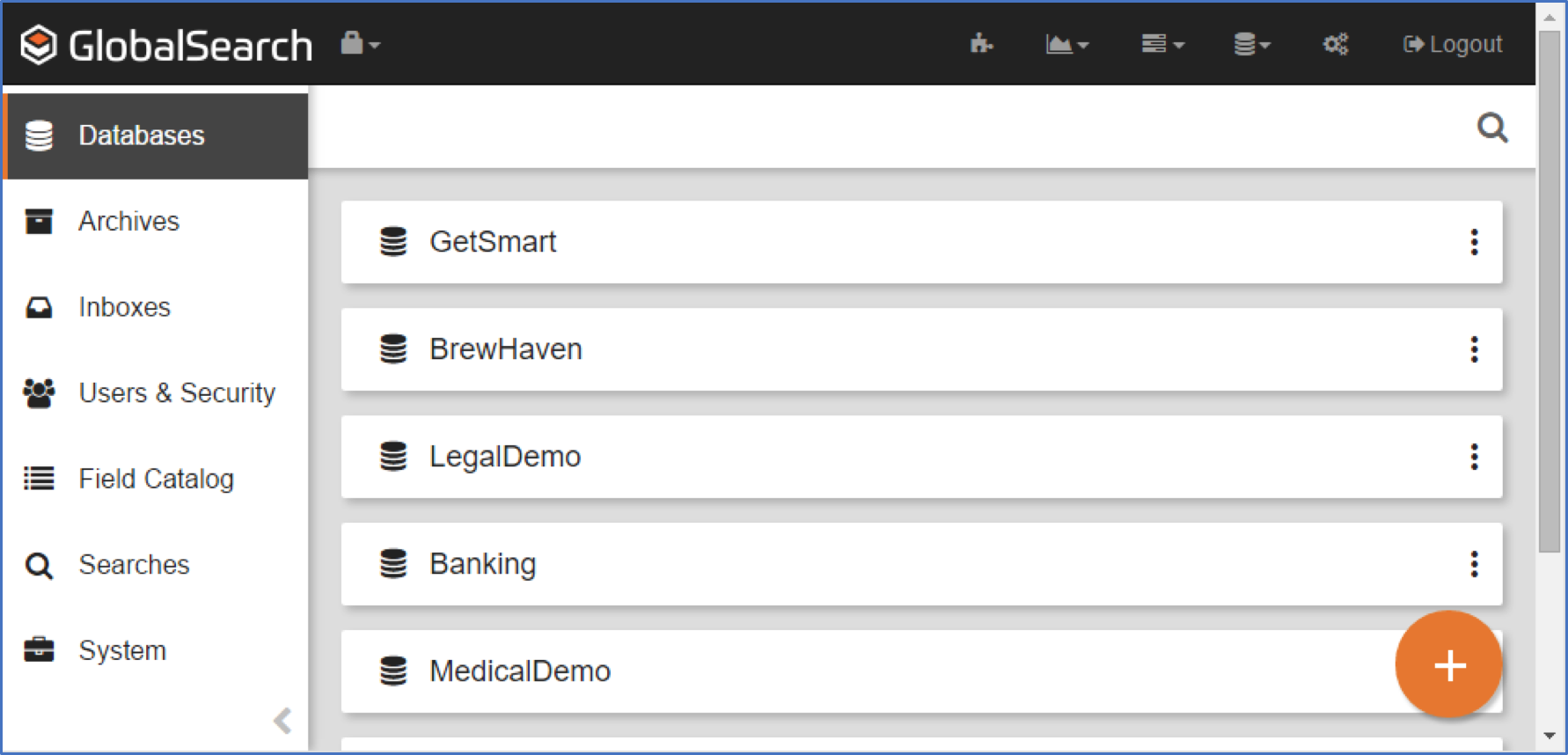 In the vertical Administration menu, select Databases. A list of the GlobalSearch databases will appear. The default database is GetSmart.