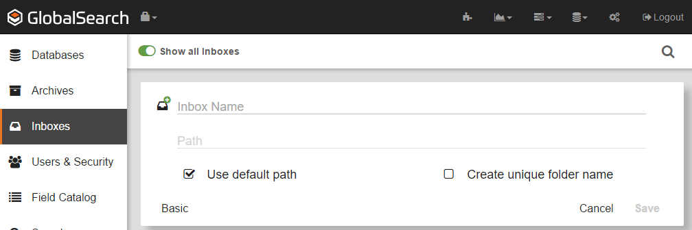 GlobalSearch was installed using either the default database locations or a customized location. Leave Use default path enabled to store your Inbox files in a sub-directory of the default path specified when the desktop client was first installed. This path is visible, but not editable. You must deselect Use default path when changing the path. If your GlobalSearch desktop client was installed using the defaults, the default path an Inbox directory is created under c:\GlobalSearch\Inboxes.