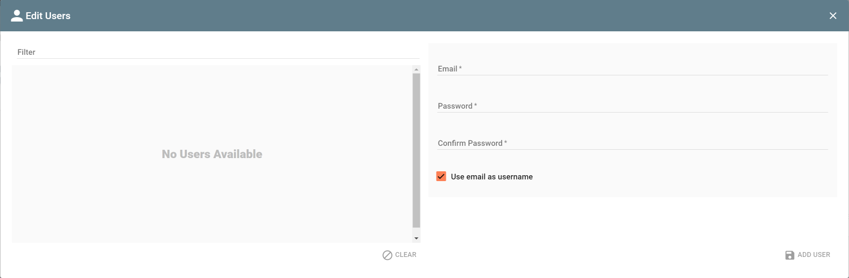 In the edit users panel, provide an Email Address, Password, and Password Confirmation. Note that username must conform to a valid email address.