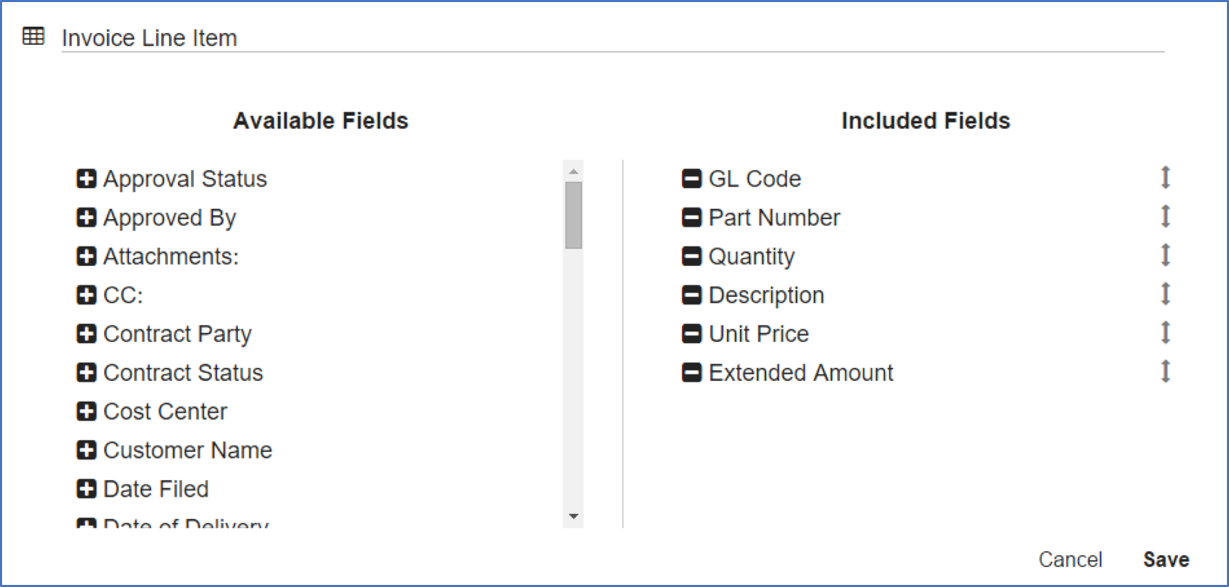 - Click the Delete (-) button to move a Field back to the Available Fields list.