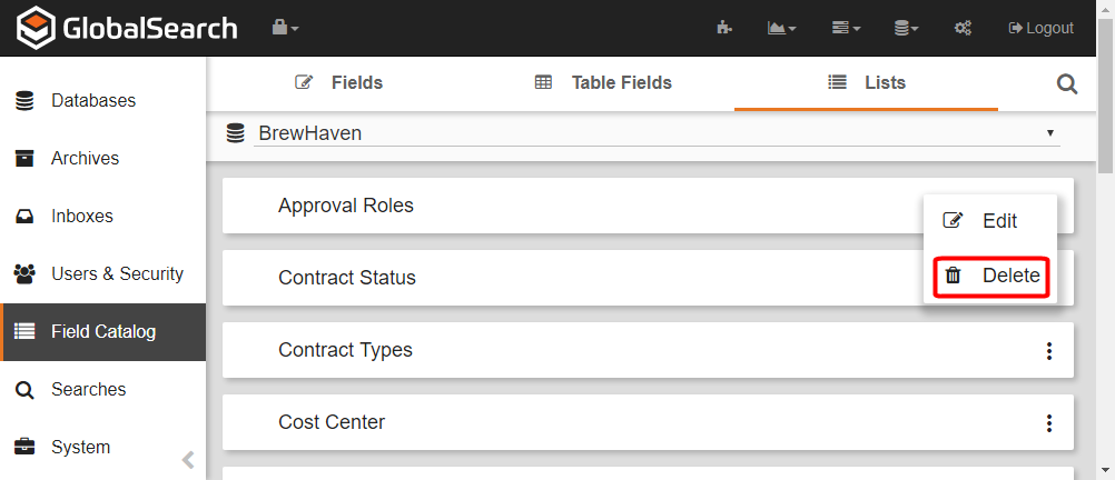 - To delete a List, on the Field Catalog toolbar, click Lists. A list of Lists in the database will appear.
