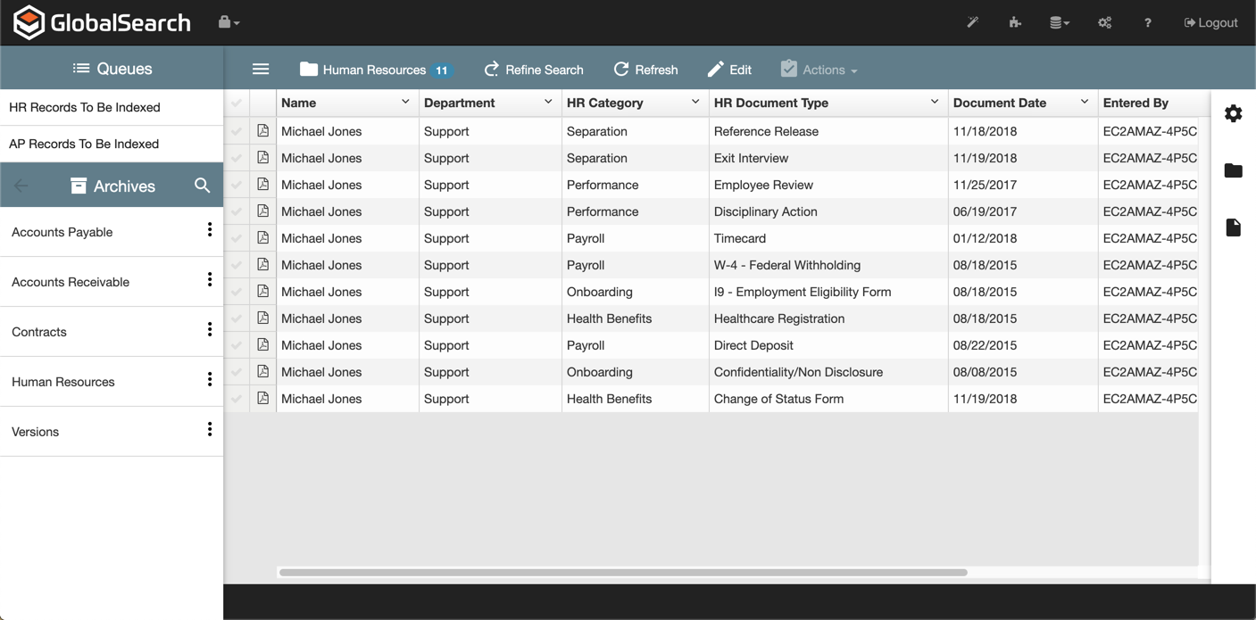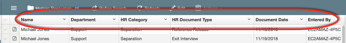 When you run a Search, the results appear in the Search Results Document List. This is a list of all documents that meet your search requirements. From there you can adjust how the results are displayed. You can sort the list and reorder the columns to more easily locate specific documents. The results are presented in a grid where the display can be customized, data can be edited, and the history of actions taken on a record can be viewed and exported.