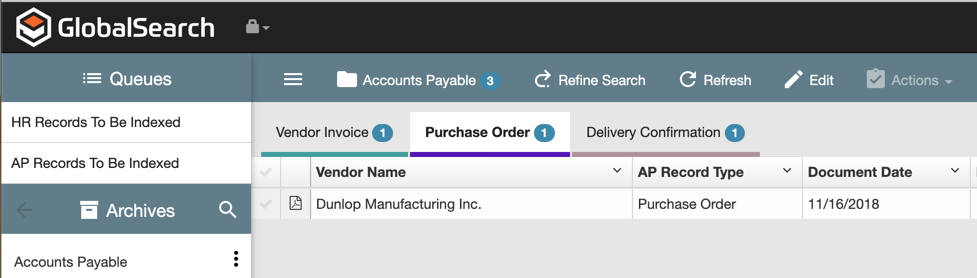 View tabs are used to control how results are grouped in the Document List. They could be used, for example, to search for Accounts Payables records and present them by type or by Status (New, Pending, Approved. View tabs are only available if your administrator has enabled the feature. Tabs will display the label of the View and the number of records returned for each tab within the Search. Tabs may also be assigned different colors for immediate identification.