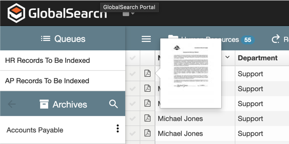 Below the the header row are the results, displayed as one record per row. Rows appear in descending order of date entered into GlobalSearch, by default. The first cell contains the Select Document checkbox for the record and the next contains its Preview Thumbnail icon. Preview icons are contextual; which type displayed depends upon the type of document for that row. Remaining cells in a row contain the indexing data (if any exists) for each available Index Field. Which Fields appear is contextual as well. Fields may be moved, resized, or hidden, depending upon how you configure your Search Results and the results grid.
