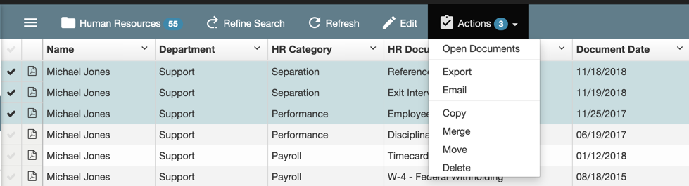 You can enable one or more Select Document checkboxes and use the features in the Actions. menu. Menu options include, exporting, emailing, copying, merging, moving or deleting the selected set of records. To open a single record you can simply double-click on any cell in a row to access the Document Viewer.
