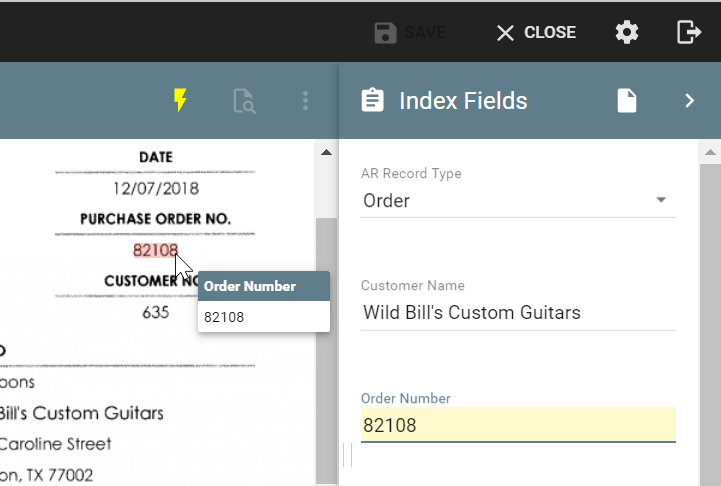 Use KeyFree Indexing to rapidly extract high-value data with without the need for hand keying information. Just point to a value to select the text on the document and populate your Fields.