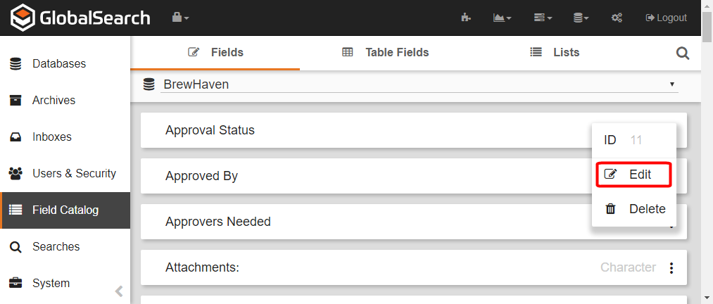 - To edit a Field, on the GlobalSearch toolbar, in the Administration menu, select Administration.