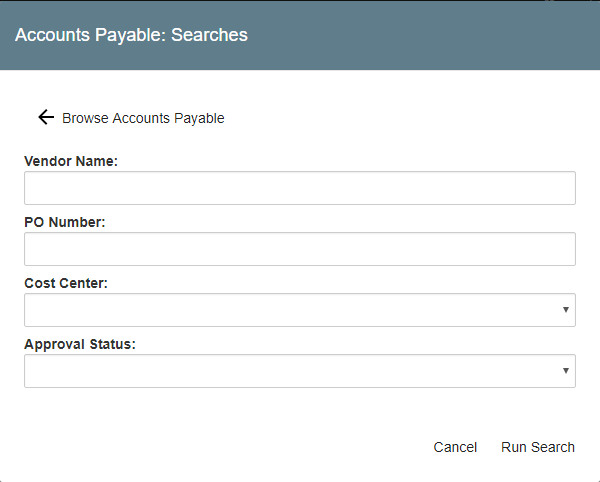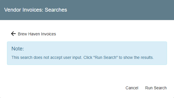 Click Run Search to show the search results, choose Cancel to close the dialog without running a Search, or click the Back (left arrow) icon to return to the list of Searches.