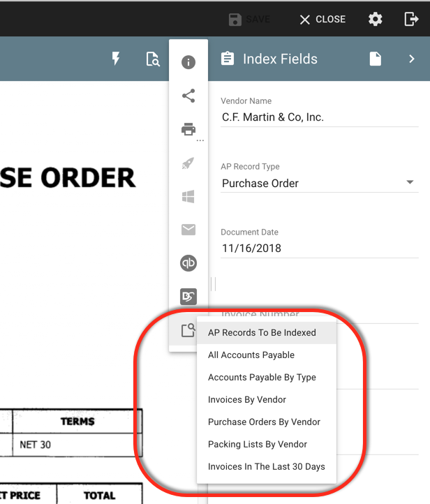 When you are working with a document it is common to need to reference similar or related documents. From the Document Viewer toolbar, click the ellipses at the far right of the toolbar to expose available document actions and select Related Searches. From the drop-down list of available Searches, select a Search. The Search will automatically populate values from the document that you have opened in the Viewer. To return to your original document in the Document Viewer after viewing a searched document, click your web browser Back button.