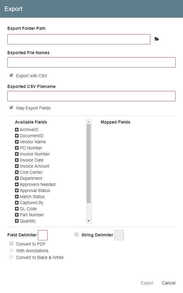 You can export the data from all available Fields or choose just the ones that you need. To map Index Fields to CSV files, enable Map Export Fields. The full path to the exported file is always included as the last field in the data file.