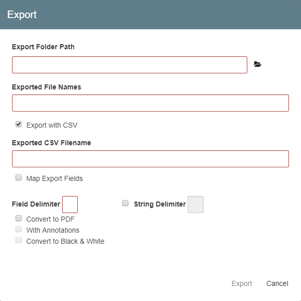 Enter a name for the CSV file in the Exported CSV Filename text box. You do not need to provide an extension here. If you do, it will be ignored. On export, the file will be placed in the designated export folder path and will be suffixed with an underscore and the selected Archive's name.