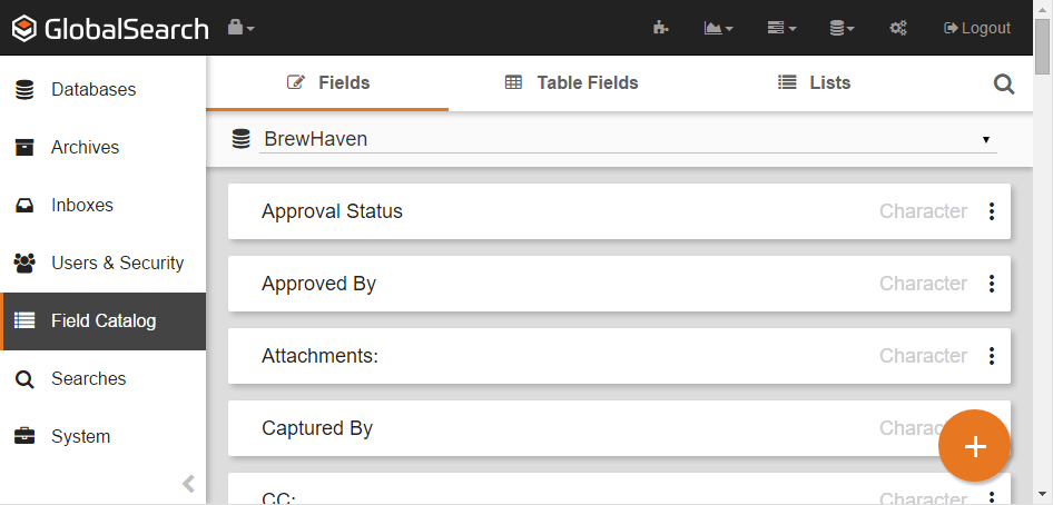 To create, edit, or delete Fields, Table Fields, or Field Lists, on the GlobalSearch toolbar's Administration menu, select Administration. In the vertical Administration menu, select Field Catalog. A list of the Fields for the select database will appear.