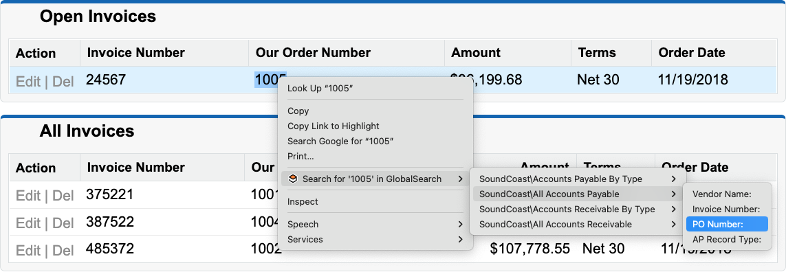 Right Click and select a search to run and an index data field to pass the highlighted data to under Search for “highlighted text” in Globalsearch.