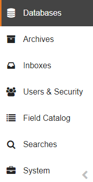 From here, you can access the GlobalSearch Administration interface, where system administrators can create Square 9 Users and set database permissions for both Square 9 Users and Windows-based users. This vertical navigation bar can be minimized using the Minimize (arrow) button at the bottom of the bar.