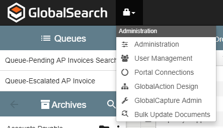 If you have administrative permissions as a member of the SSAdmin group or a database administrator, you will see the Administration () icon just to the right of the GlobalSearch logo.