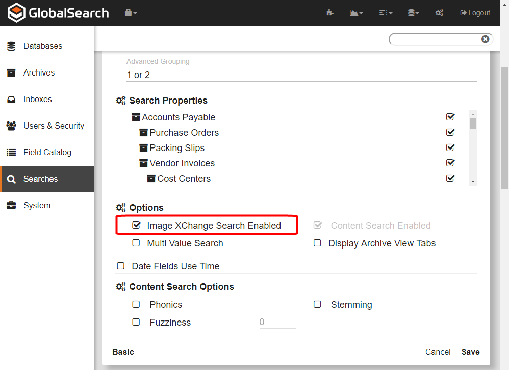 - To make a Search accessible to Image XChange, create or edit a Search for the Archive, click Advanced, and in the Options group, enable Image XChange Search Enabled.