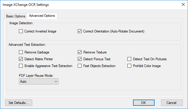 In the Image XChange OCR Settings dialog, select Advanced Options and choose from the following settings.