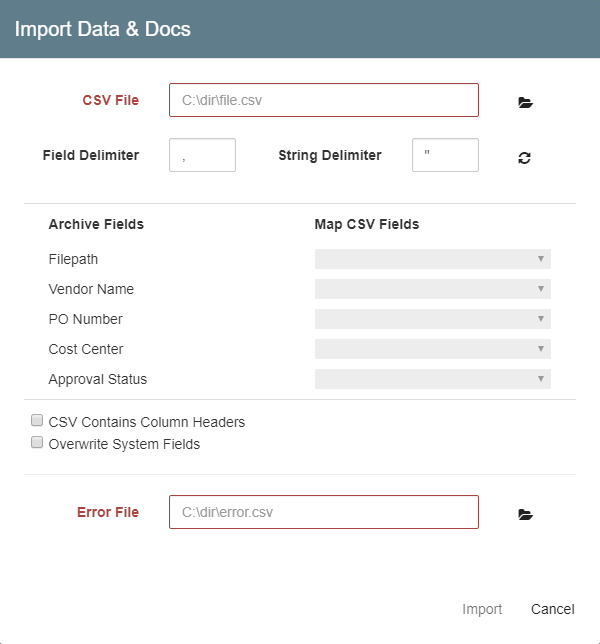 - In the Import Data & Docs dialog box that appears, enter the full path or click the Folder icon to browse to the CSV file in the CSV File text box.