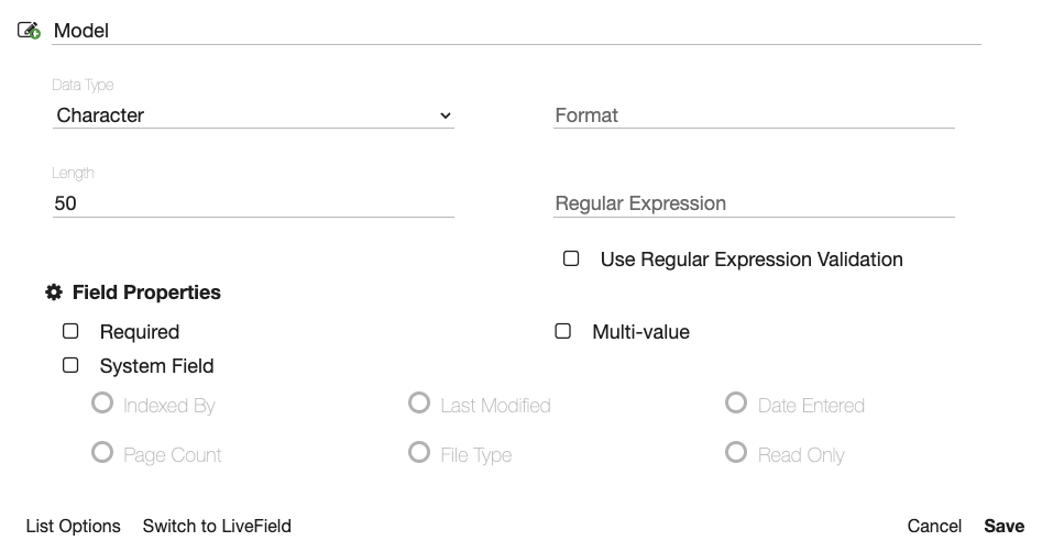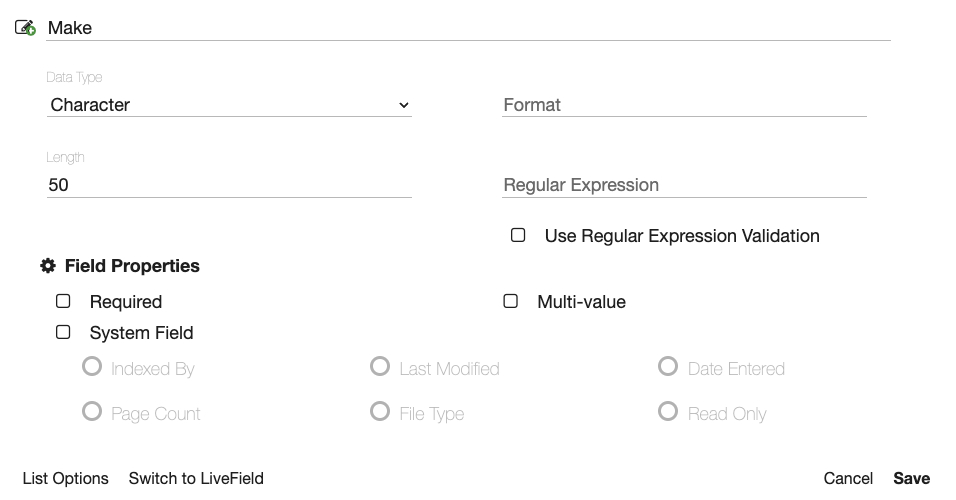 An Index Field without a List is the default setting in GlobalSearch. There are two types of Field Lists; Standard, and Dynamic.