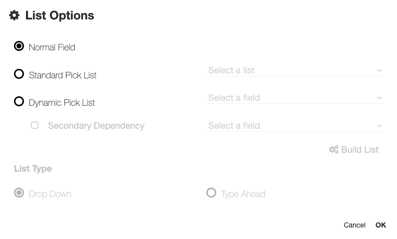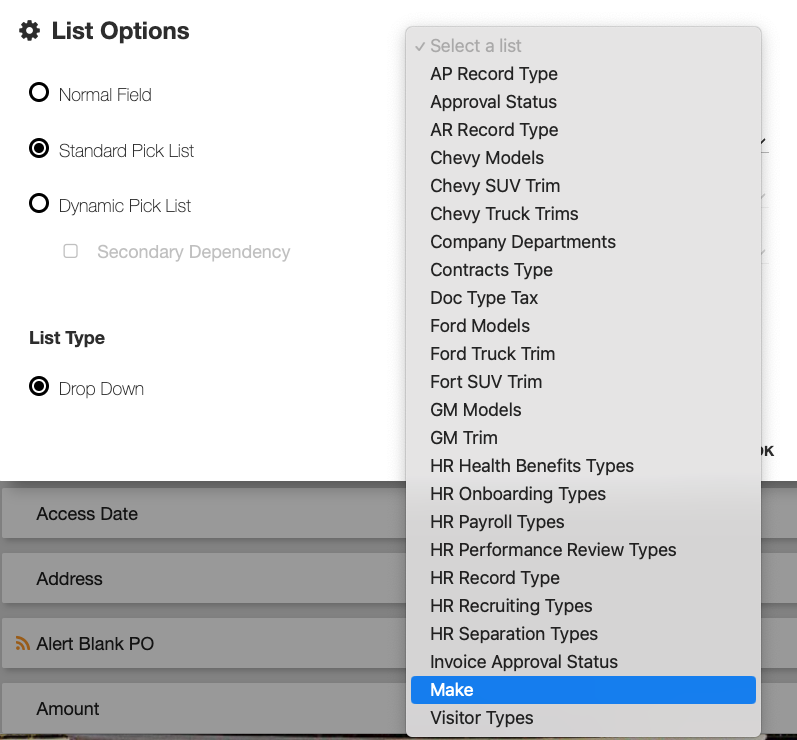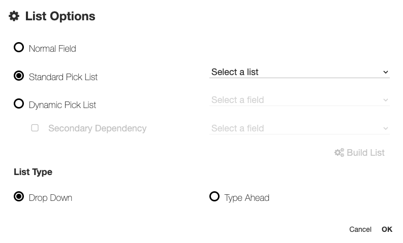 A Standard Pick List is a list of choices for the Field where users may select a value. It can be set as either a drop-down or a type-ahead type of list. Standard Pick Lists can of a Dropdown or Typeahead style.
