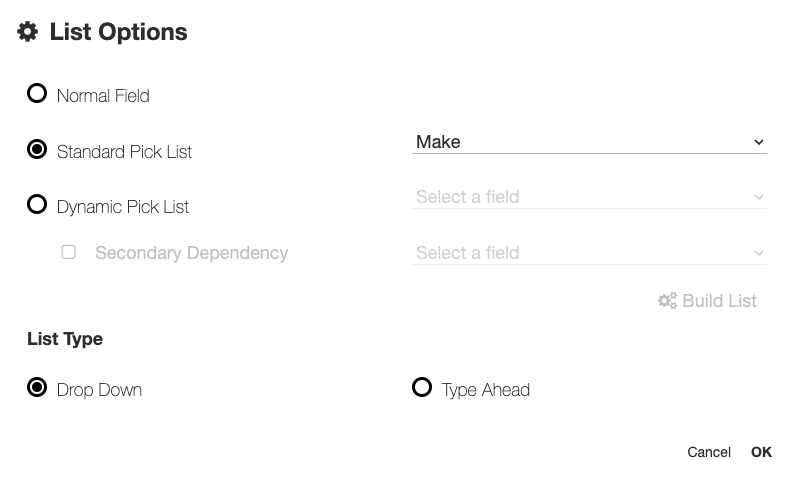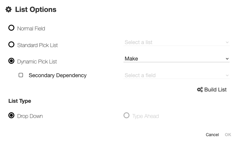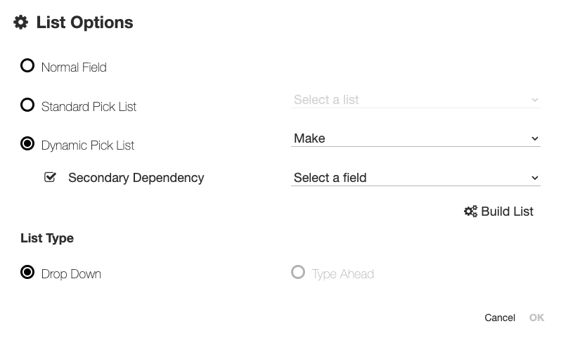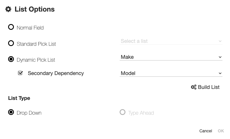 Example: If we wanted to build dynamic pick lists for a car dealership who would like to store deal jackets with the Make, Model, and Trim of the sold vehicle, we would need the following fields and lists: