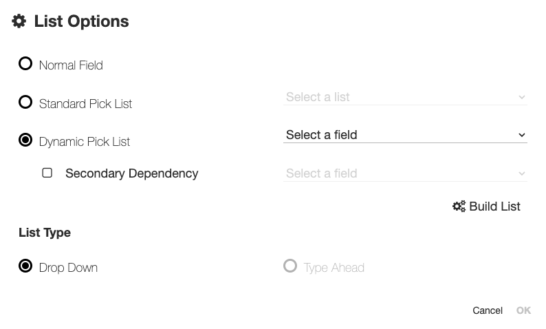 Preplanning your fields and lists will make construction of dynamic pick lists a breeze. Dynamic pick lists can have up to 2 levels of dependencies so you will need to plan up to 3 fields and however many lists that are needed. It is important that your list names clearly identify the items in the list since you will be using the list name when mapping. Click here to learn how to Create Lists.