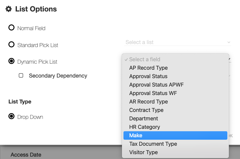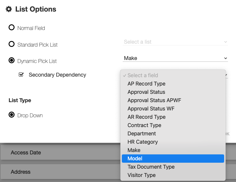 A Dynamic Pick List allows you to filter drop-down fields in a pick list based on information selected in a separate, related field. Pick lists used to build Dynamic Pick Lists must be drop-down lists and the Dynamic Pick List cannot be a Multi-Value List. Use a Dynamic Pick List, for example, to first select a car from a list of vehicle manufacturers; it will then show only models based on the make of car selected.