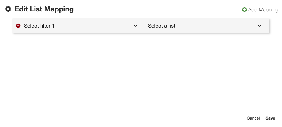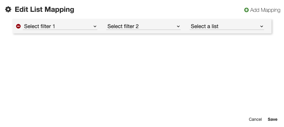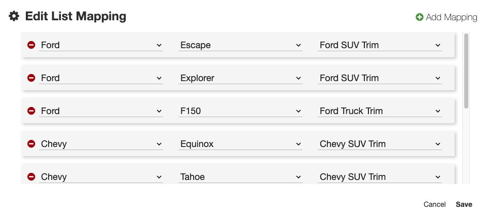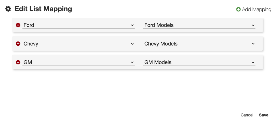 - Continue to click Add Mapping to map each value in the primary list to the list that will appear in the First Dependency field. If no mapping is provided for any value in the primary list, if that value is selected, the first dependency will remain inactive.