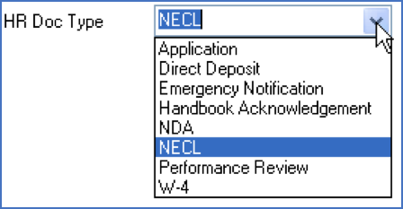 A Dropdown List provides a set list of Index Field values for users to choose from. This keeps Index Field data values consistent, so that searching is more complete and accurate. A Drop Down List is indicated by a drop-down button to the right of the Index Field. Drop Down Lists are usually used when there is a need to restrict user input, such as document type, GL code, or department name.