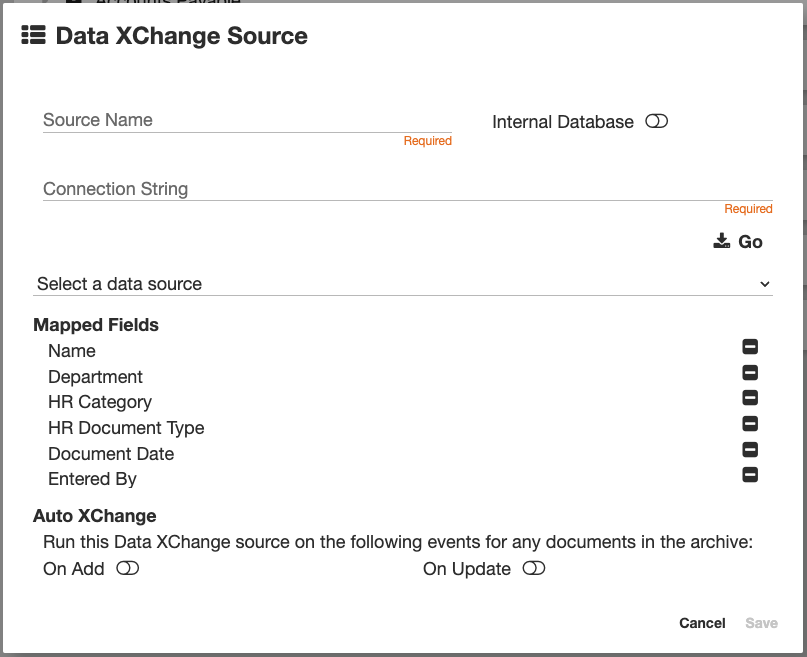 Beginning with GlobalSearch version 6.3, Data XChange can be configured to run automatically at the time of indexing a new document, or at the time of updating an existing one. Enable the On Add or On Update toggles in the Data XChange interface to configure automatic data updates. Users can still manually trigger any Data XChange source that is configured to run On Add or On Update.